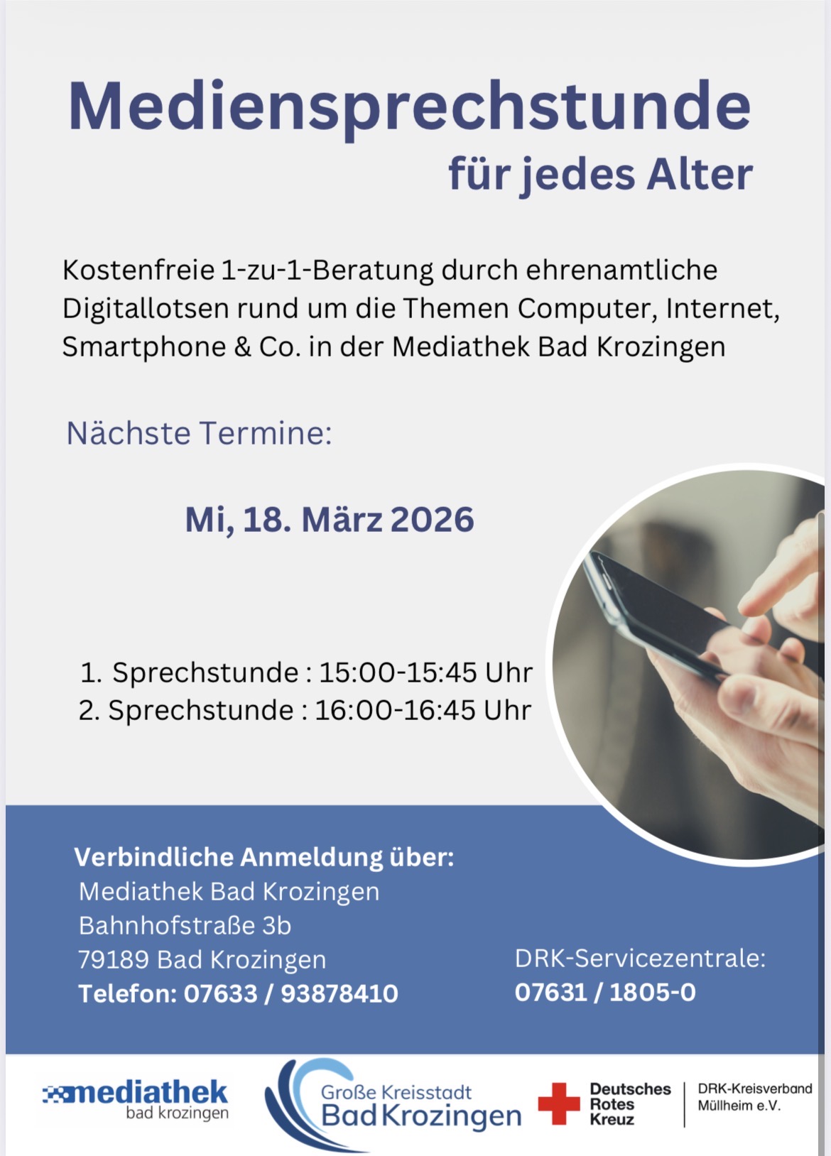 Kostenfreie 1-zu-1-Beratung durch ehrenamtliche Digitallotsen rund um die Themen Computer, Internet, Smartphone & Co. Die Mediensprechstunde findet in der Mediathek Bad Krozingen statt.