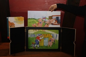 Der Geschichtenerzähler schiebt seine Bilder in den Bühnenrahmen und beginnt, wie beim Bilderbuch, Bild für Bild zu erzählen. Das funktioniert mit fertigen Bildkartensets genauso gut wie mit selbst gemalten und selbst erfundenen Geschichten oder Bilderbüchern.